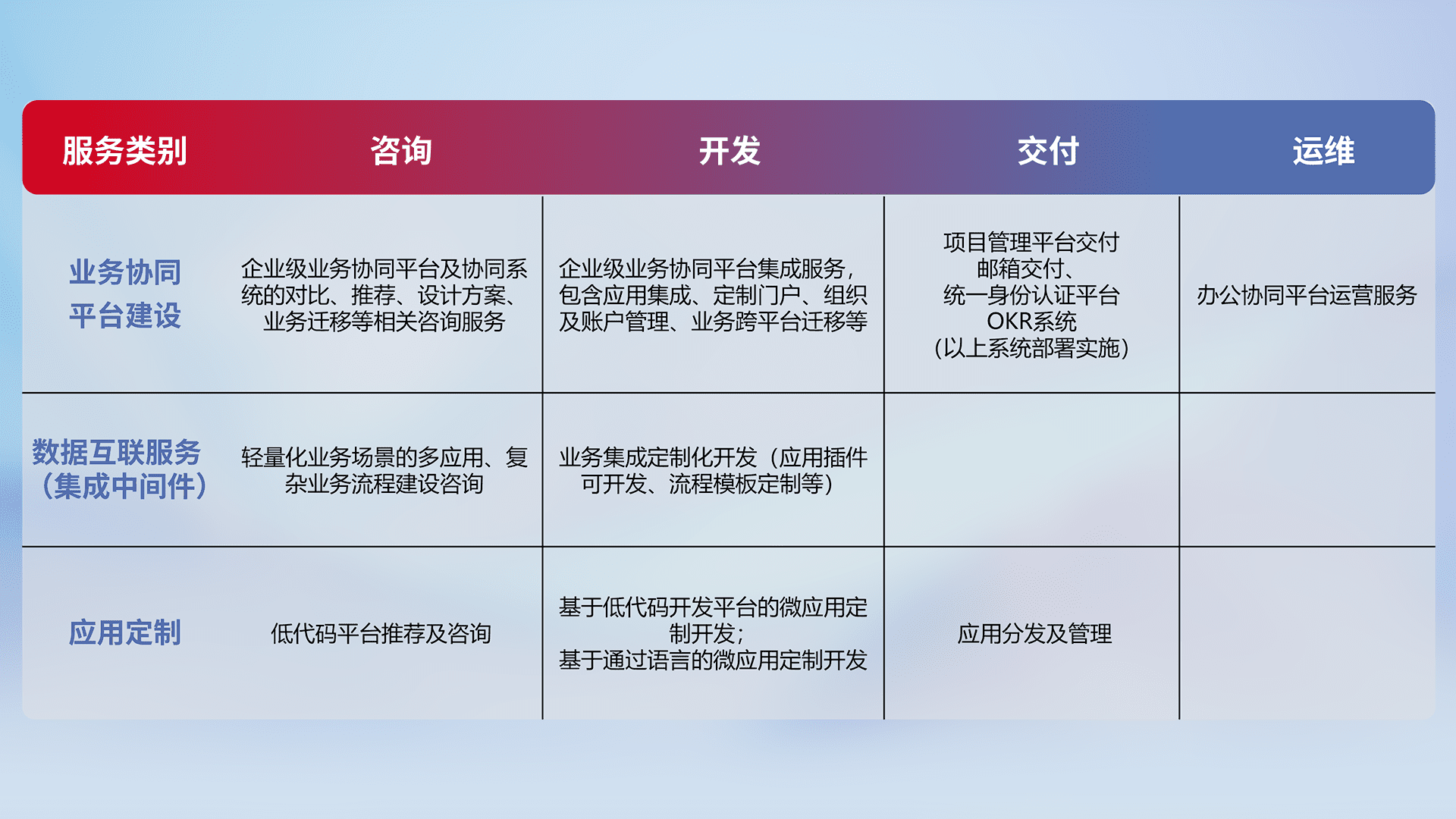 针对钉钉、、企微、、IDaas等平台级产品提供产品的规划、、方案、、、交付、、、、定制化开发等服务,,实现如统一协同办公、、、、智能客户服务、、混合会议管理、、、智能数据查询、、、等业务场景,,,,实现数字化转型。。